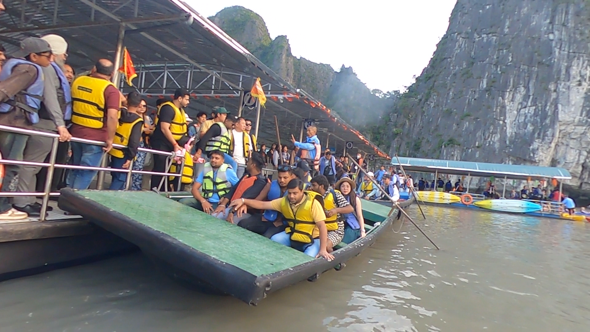 Premier choc : la foule. Des dizaines de bateaux alignés, des groupes guidés par des drapeaux, des voyageurs qui attendent, des haut-parleurs qui résonnent. On comprend très vite que cette expérience ne sera pas exactement une retraite zen.