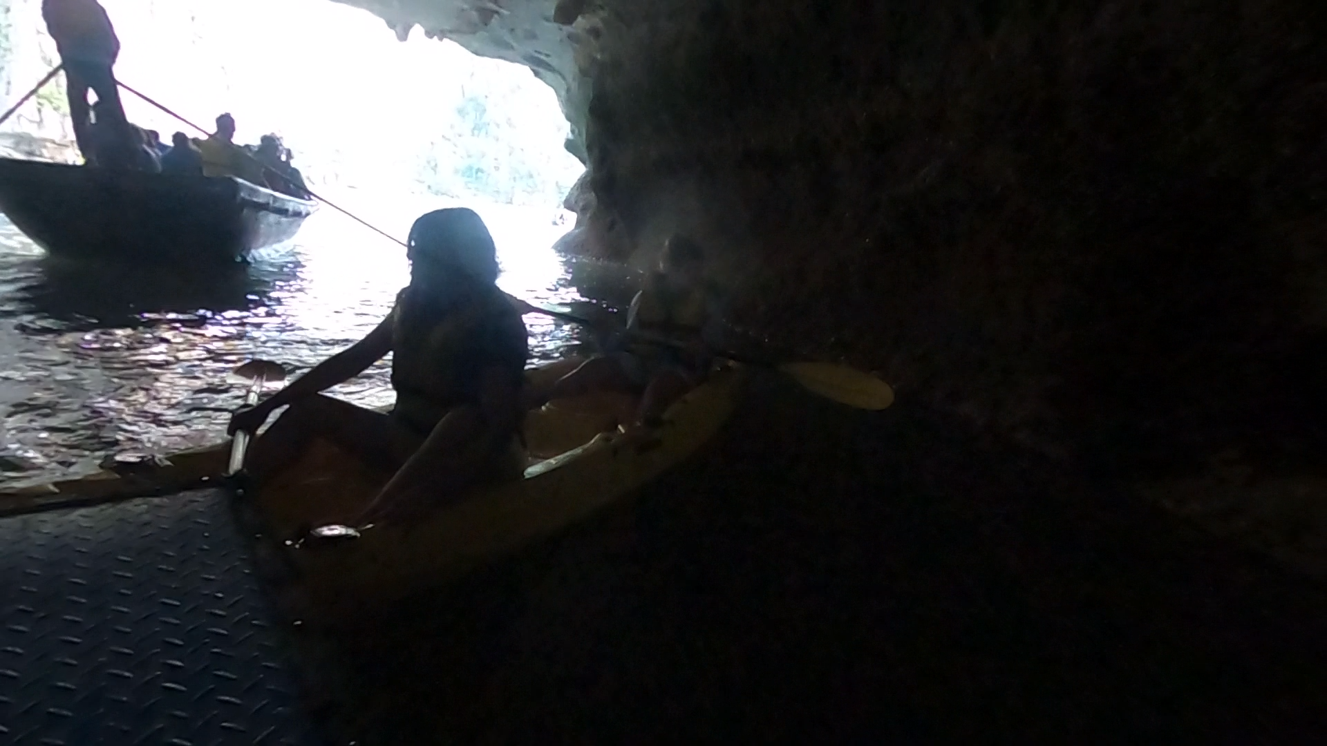 Dans la grotte, notre bamboo boat heurte plusieurs kayakistes. L’espace est étroit, les embarcations nombreuses : la situation frôle le dangereux. On rit un peu jaune… jusqu’au moment où un groupe de Chinois commence à chanter des chants traditionnels.