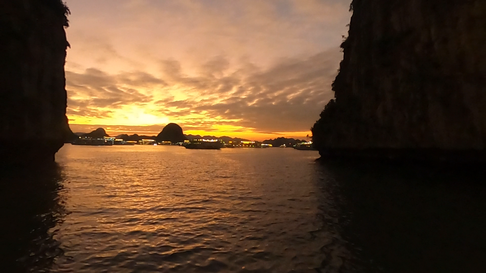 Alors que la journée touche à sa fin, le soleil disparaît peu à peu derrière les rochers. Le ciel passe du doré au violet, les lumières des bateaux se reflètent sur l’eau, les falaises deviennent des ombres noires. L’ambiance se transforme : tout ralentit, tout se pose.